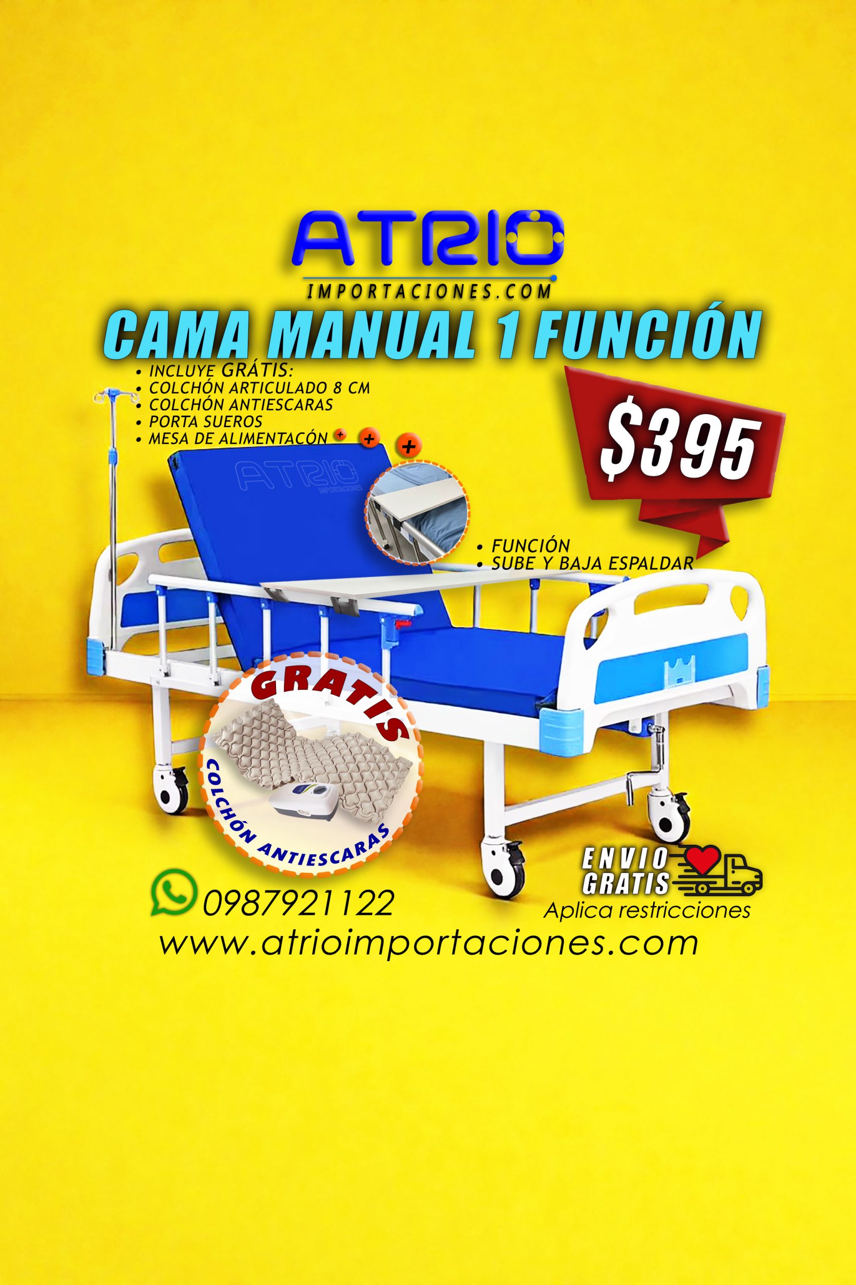 * $340 -> Cama Hospitalaria Manual 1 Función, frenos en las cuatro ruedas, Barandales de Seguridad, Portasueros, Sí Incluye colchón Hospitalario de 8cm.