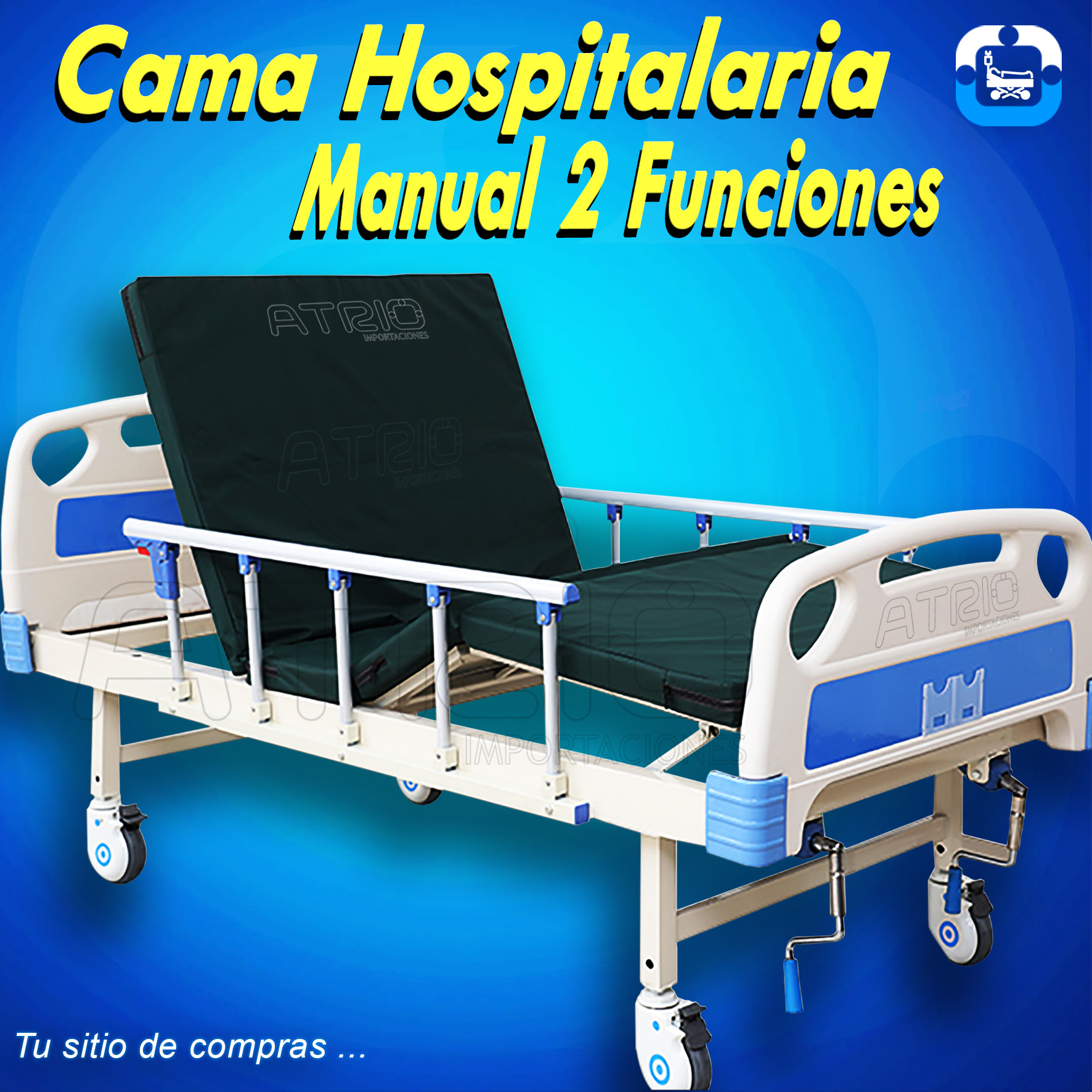 * $399 -> Cama Manual 2 Funciones, frenos en las 4 ruedas, Barandales de Seguridad, SI Incluye Colchón Hospitalario.
