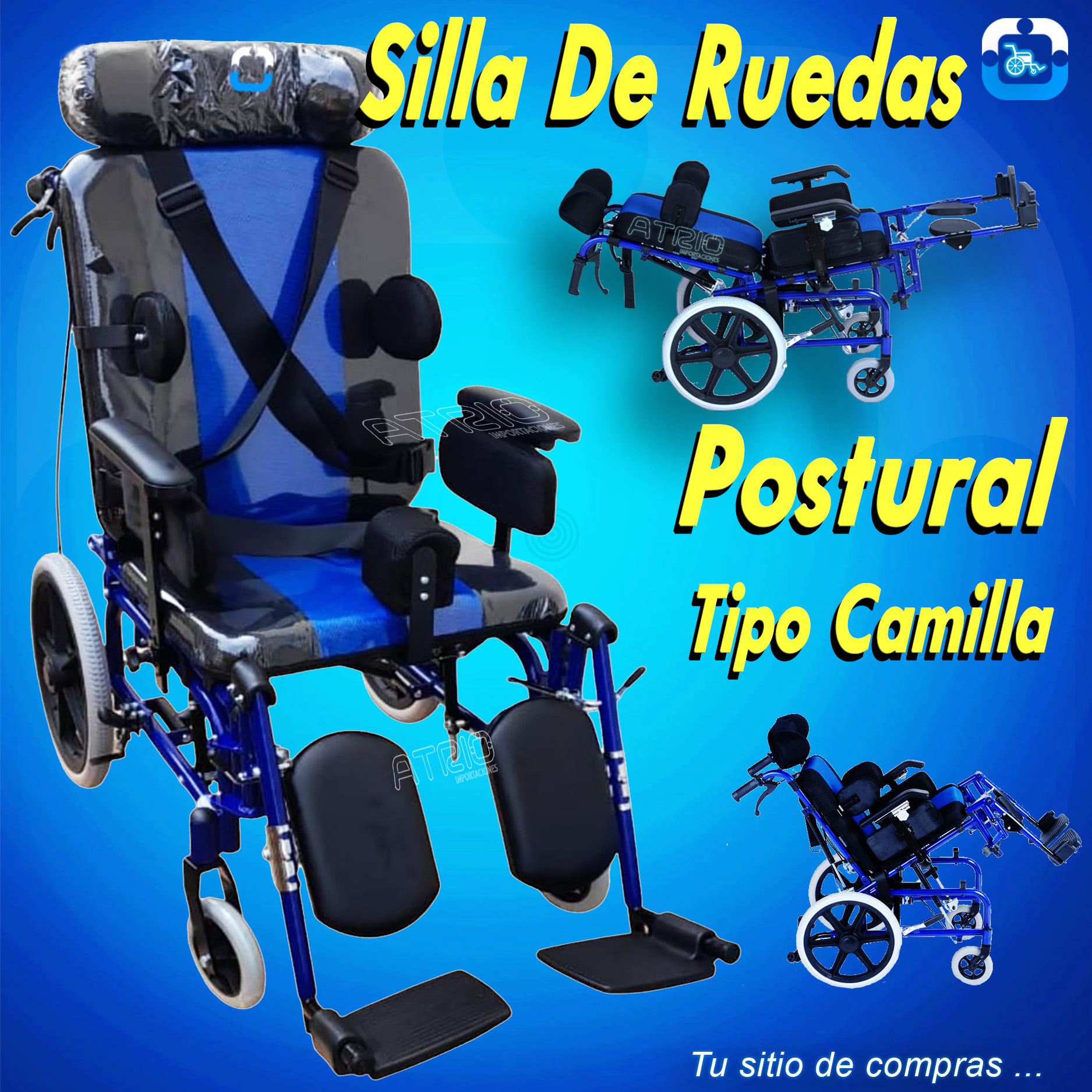 * Reposa pies: Dos (2) reposa-pies, desmontables, regulables en altura, elevables, en plástico resistente, con sujetadores para pantorrilla en lona.